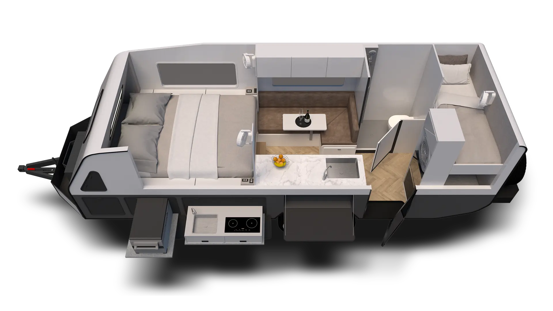 Step outside and you’ll find a premium slide-out kitchen with a dual-zone induction cooktop, sink, fold-down prep bench, and large fridge slide - designed for seamless alfresco dining under the stars.