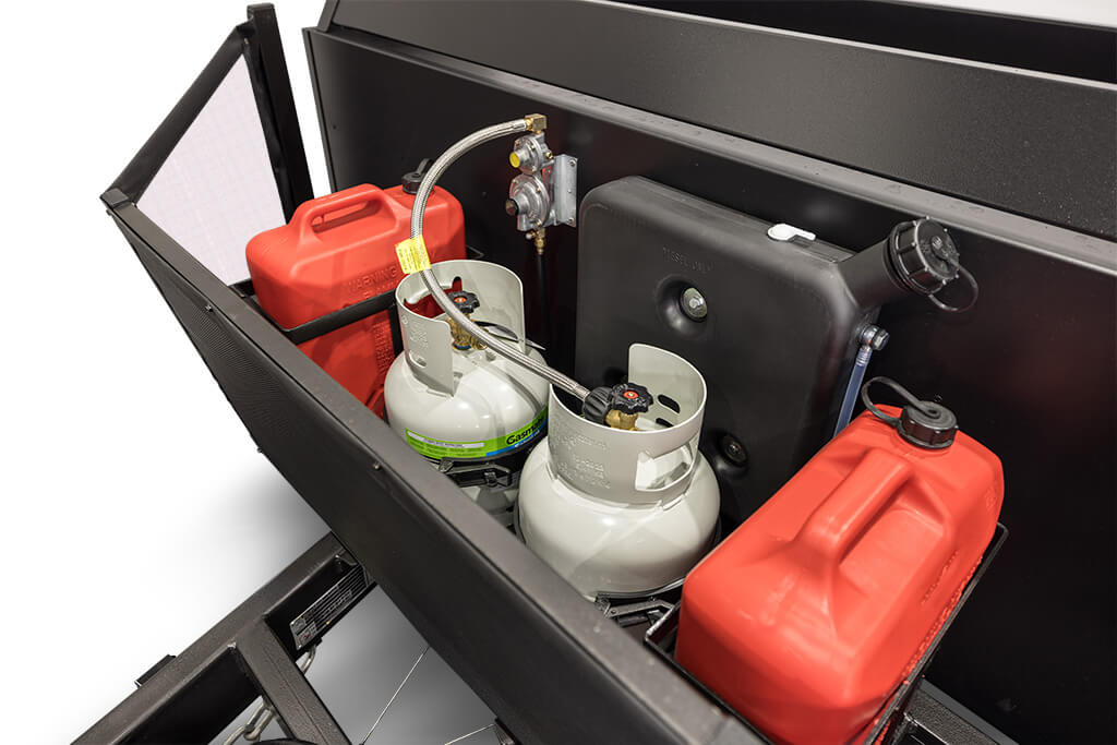 - Slide-out 3-burner stove + sink
