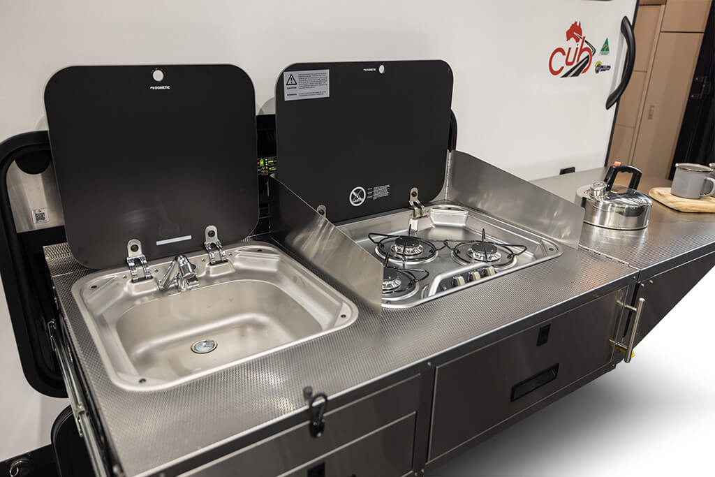 Featuring a 3-burner Smev stainless steel stove, sink and mixer tap, fold-out bench, and Ezy-Clean stainless benchtop, the layout makes meal prep easy and enjoyable.